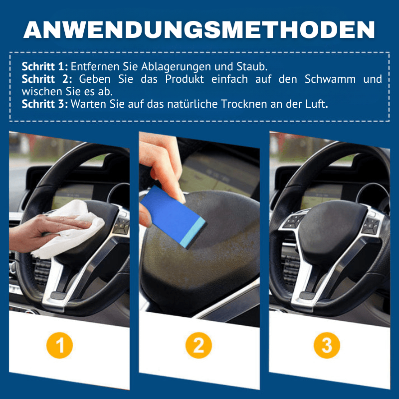 بضغطة واحدة فقط يعود كالجديد! ضع بضع قطرات على الإسفنجة المرفقة وامسح سطح البلاستيك أو القماش. من أول مسحة سترى الفرق فورًا. سهل جدًا في الاستخدام والنتيجة لامعة – مثل الجديد تمامًا!